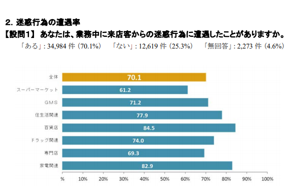 産業別労働組合のUAゼンゼンが2017年に行った調査によると、接客対応をしている流通部門所属の組合員のうち、実に70%以上の人が業務中のカスハラに遭遇したことがあると回答しています。